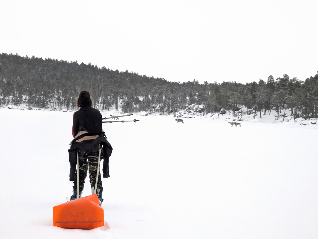 We went on a two-day hike across the lake, spending a night in a wilderness hut on an island. Crossing the endless expanse of white ice reminded me of the Bolivian salt flats, and it was a beautiful and disorienting experience! We saw a couple of groups of reindeer crossing the lake, too. Some of them stopped and waited for us, letting us herd them (or possibly be herded ourselves).