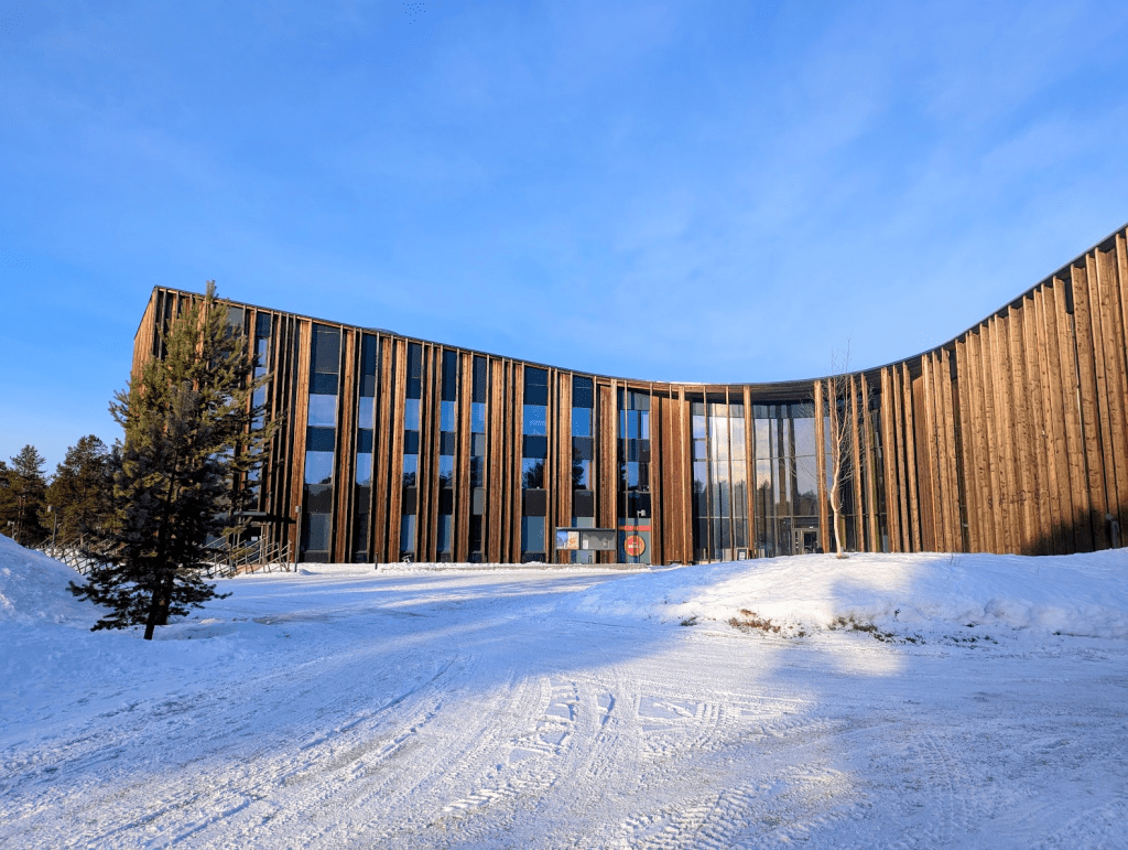 Sajos is a beautiful building of wood and glass, built to reassemble the pine forests surrounding it. Inside, it is all curved lines and warm wood tones. The building houses the Sámi Parliament, a library, a Congress hall, and a crafts shop.