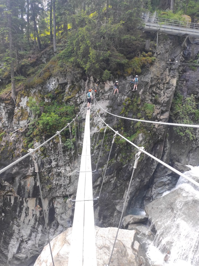 I’m only a few minutes into the via ferrata when I find myself staring down into a sheer drop. The next stage of the route is a suspension bridge, consisting of nothing more than a narrow cable for my feet, and two more at chest height for my harness to clip onto.